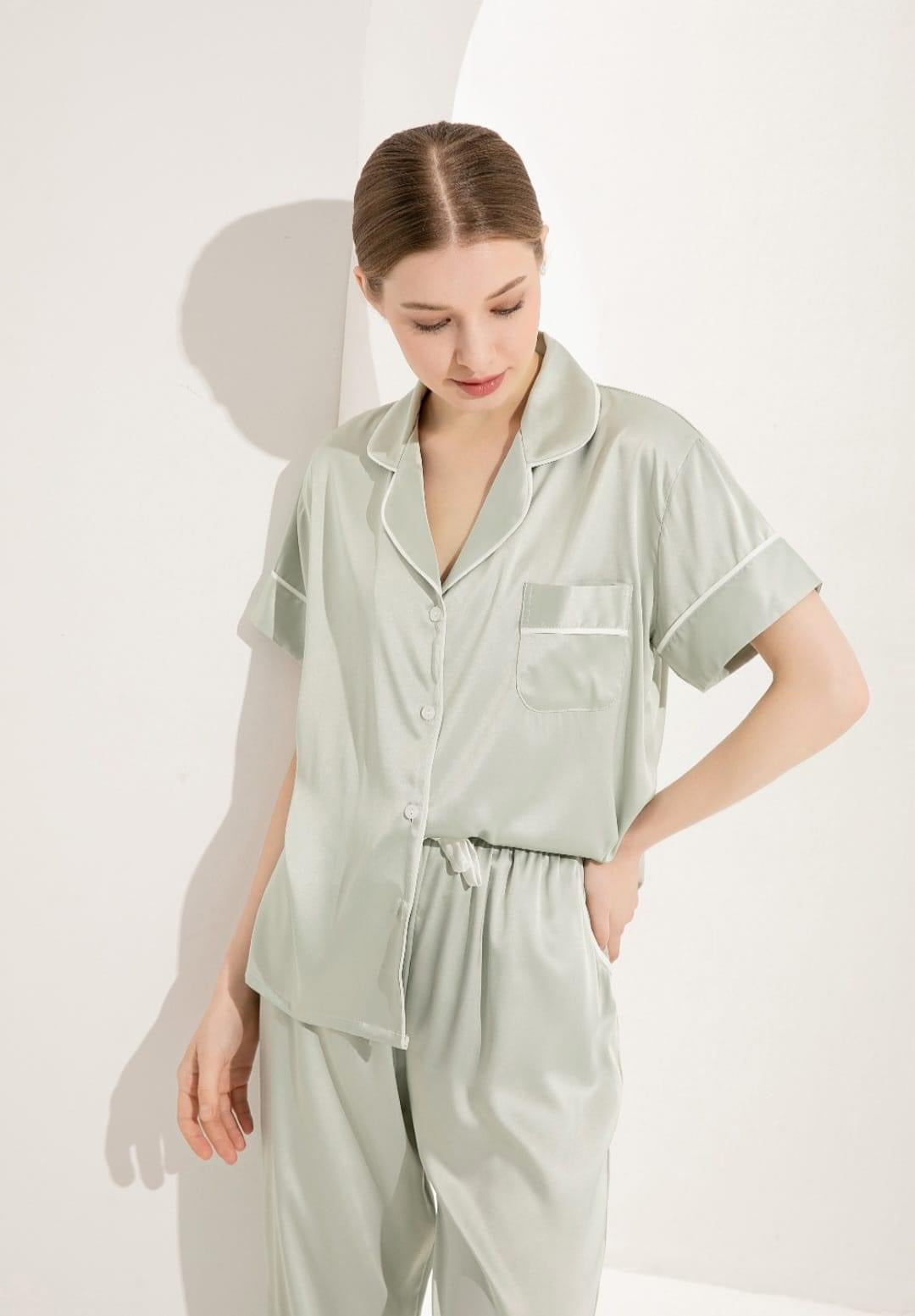 Beautiful agave green soft satin long pyjama set with white piping detail.