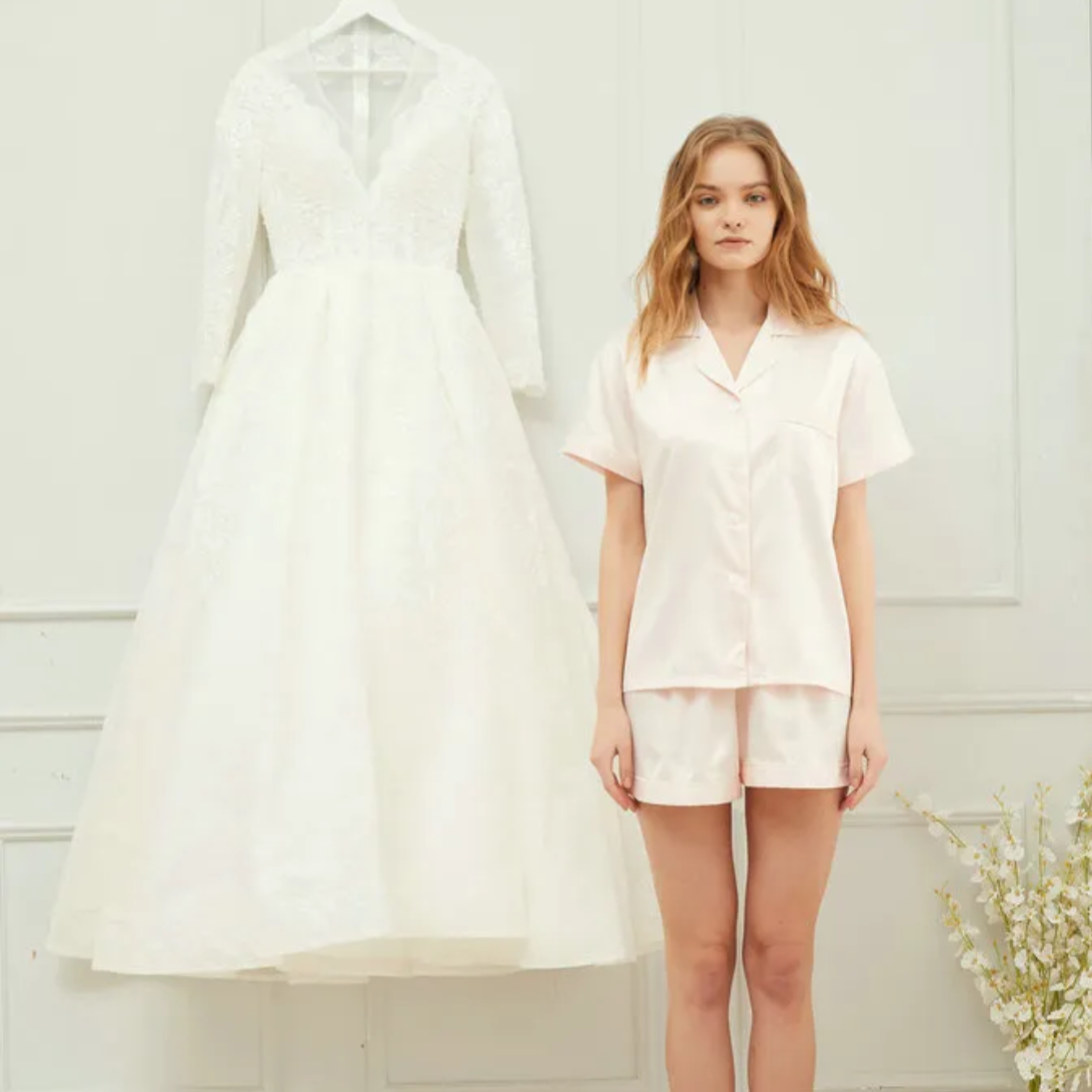 Add a touch of glamour with this beautiful soft satin pyjama set in a pale blush pink colour.