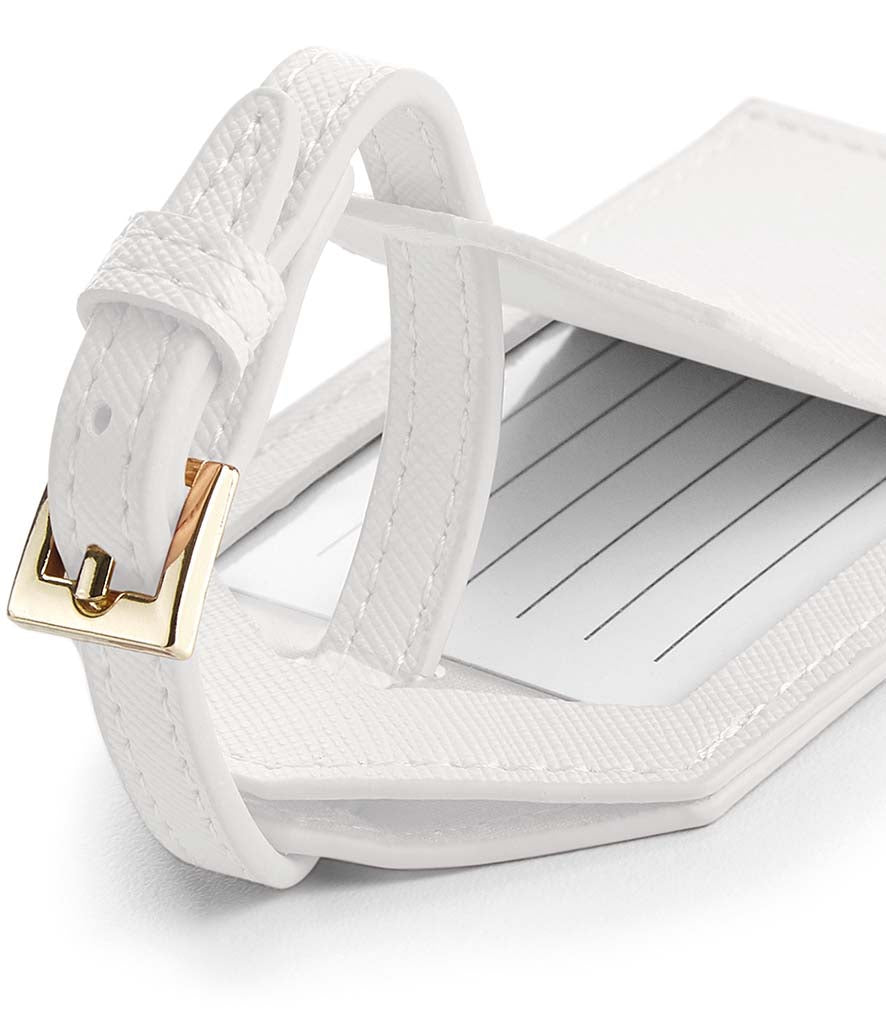 The luggage tag includes a high shine gold metal buckle.
