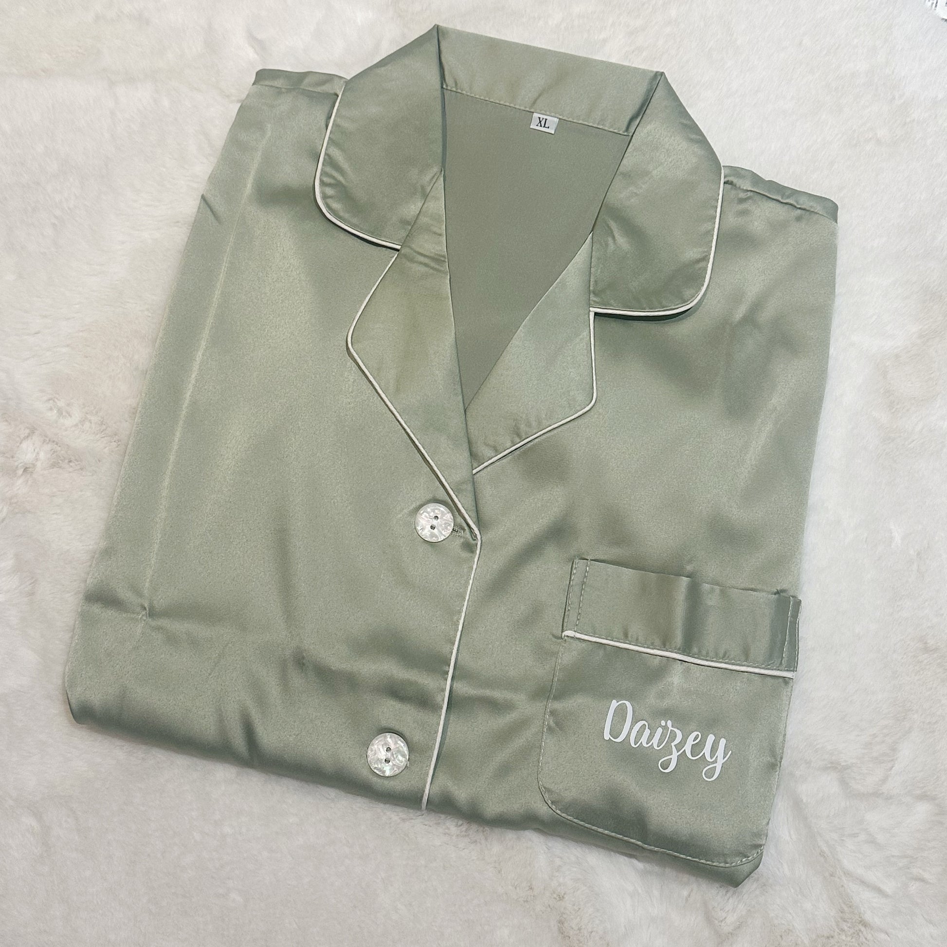 Add a touch of glamour with this beautiful soft satin pyjama set in a beautiful sage green colour.
