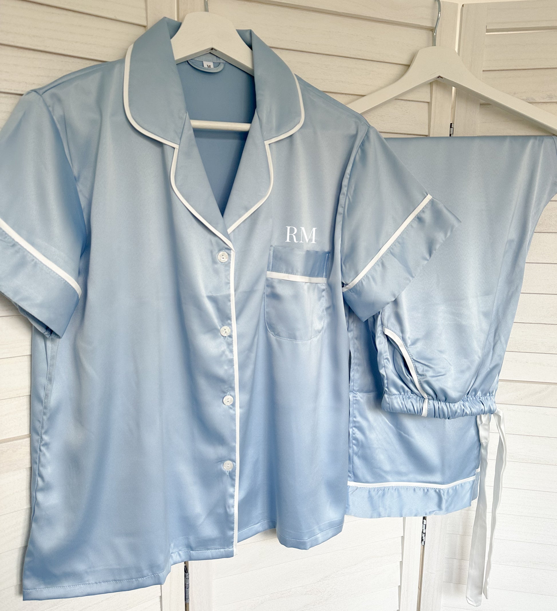 Pale Dusty Blue Personalised Short Sleeve & Trousers Satin Pyjamas